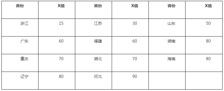 对实行高考综合改革的省份,要求高考成绩达到当地省级招生考试主管部门确定的特殊类型招生最低录取控制参考分数线上X分及以上,我校将依据公布的分省分专业招生计划,按照考生高考投档成绩从高分到低分依次择优录取,同时根据我校招生章程中的规定确定录取专业。具体X值如下表: