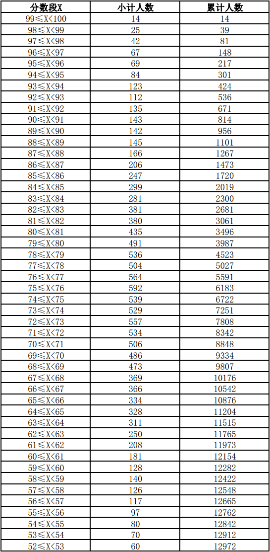 云南省2021年体育类专业统考分数段统计表 各分段人数统计