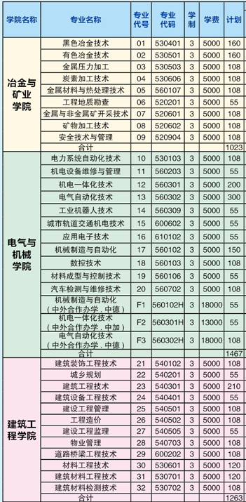 王牌专业:冶金技术,建筑工程技术,测绘工程技术,环境监测与治理技术,无机非金属材料工程技术、金属矿开采技术,机电一体化技术,无机非金属材料工程技术,会计,物流管理,应用英语,工程造价