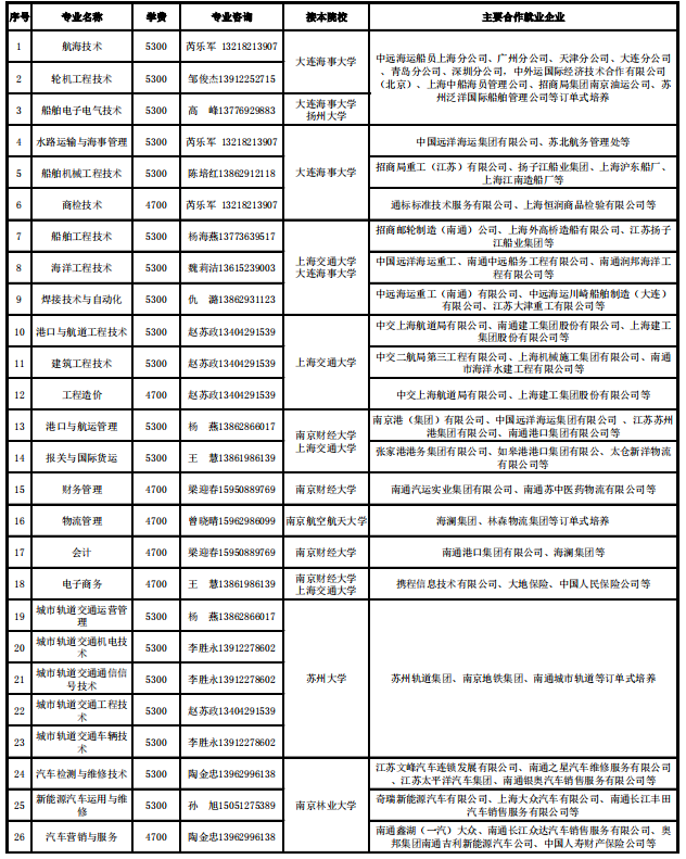 江苏省示范重点专业 | 航海技术、国际航运业务管理、轮机工程技术、港口物流设备与自动控制、船舶工程技术、机电一体化 |