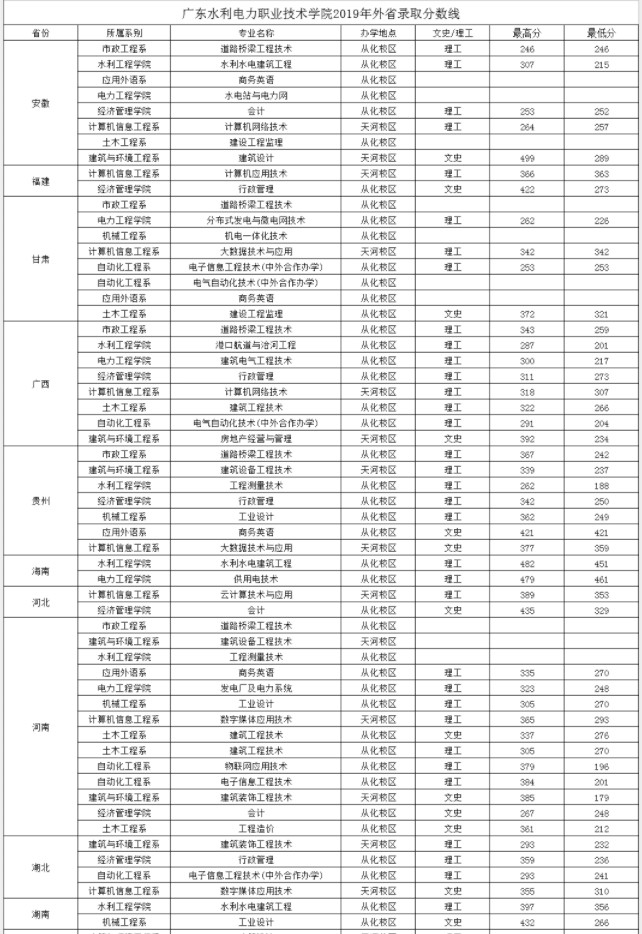 2019广东水利电力职业技术学院各省录取分数线一览表
