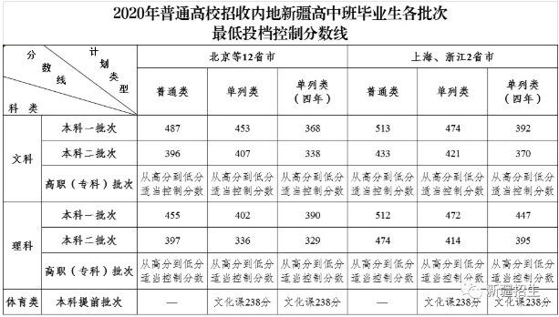 2020年普通高校招收内地新疆高中班毕业生各计划类别各科类各批次最低投档分数线确定录取工作将于8月18日开始。设本科提前批次、本科一批次、本科二批次和高职(专科)批次4个批次。