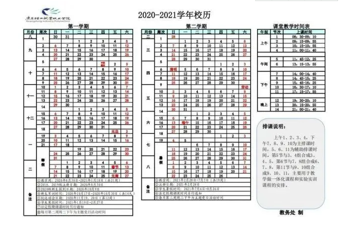 广东轻工职业技术学院发布了2020-2021学年的教学日历,通知表示,2018、2019级注册日期:2020年8月30日,2020级新生报到日期:2020年10月9日,新生军训时间:2020年10月17日-2020年10月30日(共14天)。