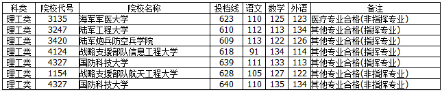 湖南省2020年普通高校招生军事院校本科计划(男)征集志愿投档分数线已经公布,海军军医大学理工类623分,陆军工程大学理工类610分。