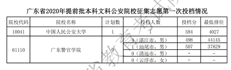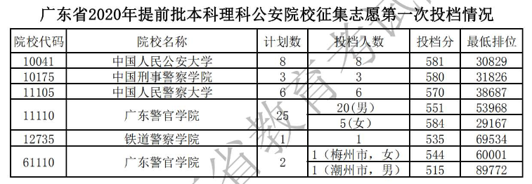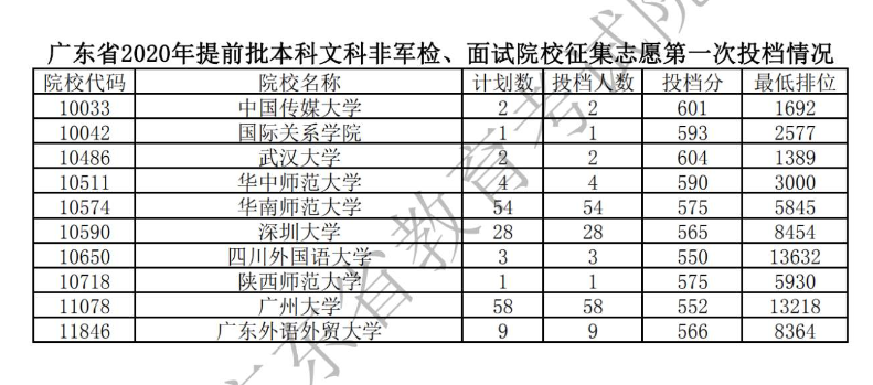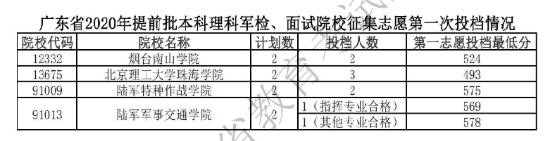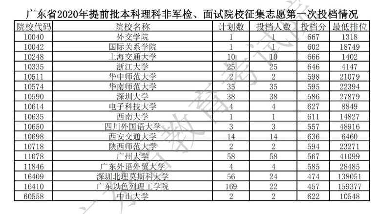 2020广东本科提前批征集志愿第一次投档分数线