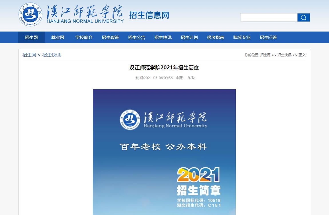 汉江师范学院2021年招生简章 时间:2021-05-06 00:02 招生简章 文章来源(官网发布地址):http://zjc.hjnu.edu.cn/info/1015/1275.htm官网发布缓存图(部分):
