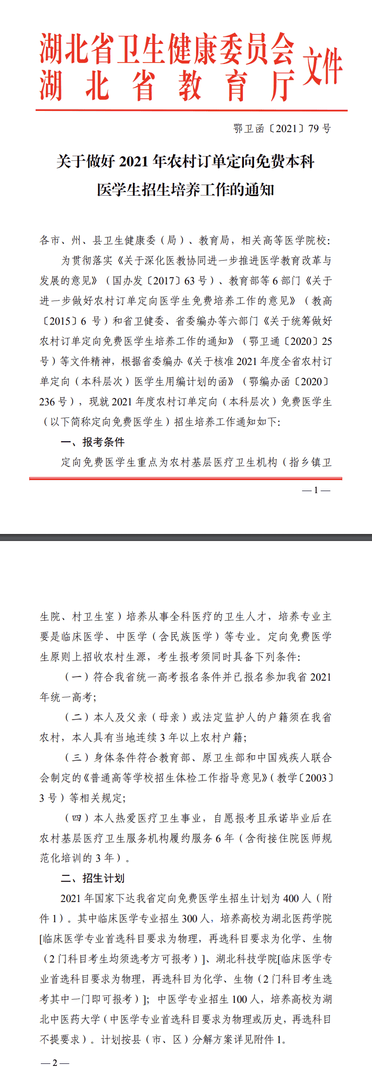 湖北:关于做好2021年农村订单定向免费本科医学生招生培养工作的通知 时间:2021-05-07 00:00 自主招生 点击查看完整内容:湖北关于做好2021年农村订单定向免费本科医学生招生培养工作的通知