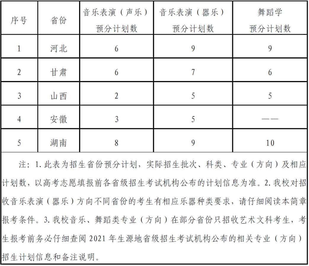 3.我校的音乐表演专业分声乐、器乐两个招生方向。招收的声乐方向考生学校仅以美声、民族唱法安排教学;招收的器乐方向考生仅限统考主专业乐器种类为琵琶、二胡、中阮、古筝、竹笛、扬琴、小提琴、大提琴、低音提琴、萨克斯、钢琴的考生。其中,古筝、二胡只招收湖南省、河北省生源考生;竹笛、萨克斯只招收河北省、甘肃省生源考生。我校音乐、舞蹈类专业(方向)在部分省份只招收艺术文科考生,考生报考前务必仔细查阅2021 年生源地省级招生考试机构公布的相关专业(方向)招生计划信息和备注说明。