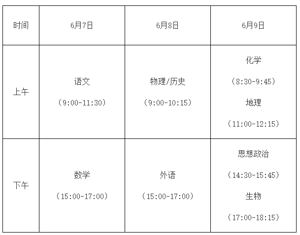 考试时间安排在6月7日至9日,共3天。语文科目考试时长为150分钟,数学、外语科目考试时长均为120分钟,学业水平选择性考试科目每科考试时长均为75分钟。具体考试安排为: