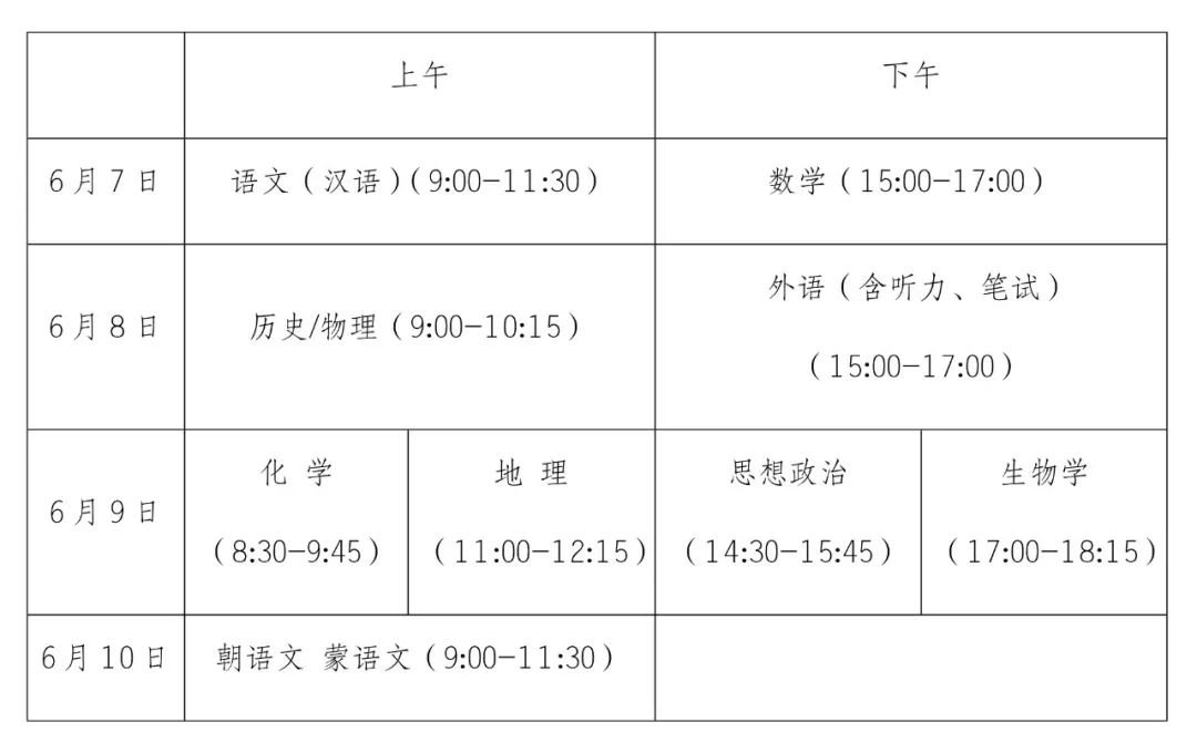 语文、数学、外语考试时间安排在6月7日全天和6月8日下午,其中语文考试时间为150分钟,数学、外语(含听力和笔试)考试时间均为120分钟。思想政治、历史、地理、物理、化学、生物学时间安排在6月8日上午和6月9日全天,每科考试时间为75分钟。朝语文、蒙语文安排在6月10日上午,考试时间为150分钟。