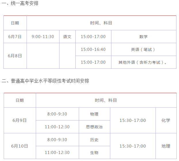 天津高考实行新高考模式,语文、数学、外语安排在6月7日到6月8日之间。思想政治、历史、地理、物理、化学、生物等6个科目考试时间安排在6月9日到10日之间。