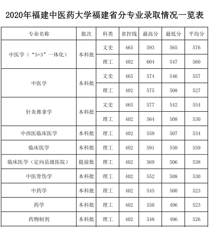 根据福建中医药大学官网发布的分专业录取情况一览表,2020年该校各专业的录取分数线详情如下: