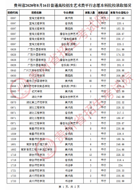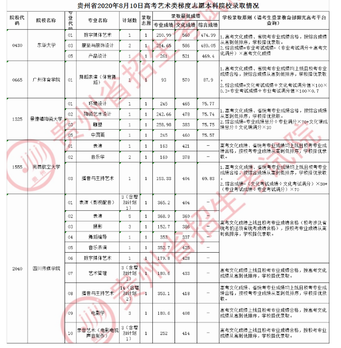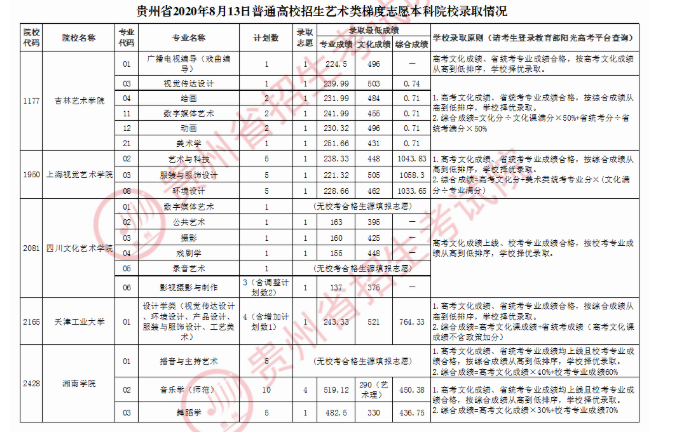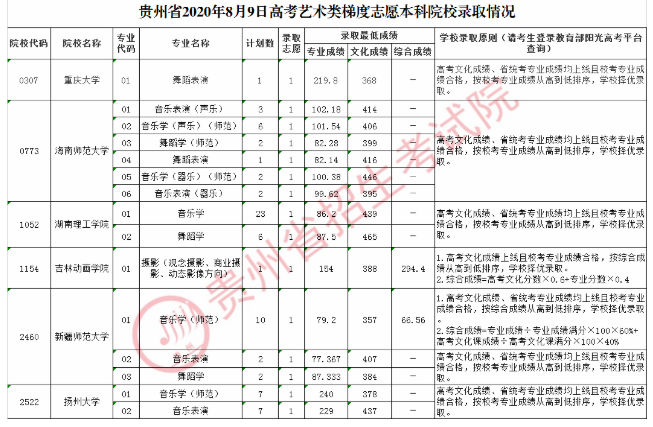2020贵州高考艺术类本科院校录取最低分 时间:2020-08-15 10:03 录取查询 目前,同学们和广大家长朋友们非常关心的2020贵州高考艺术类本科院校录取最低分已经公布。下面小编为大家详细介绍一下,供大家参考。贵州高考艺术类本科院校录取最低分