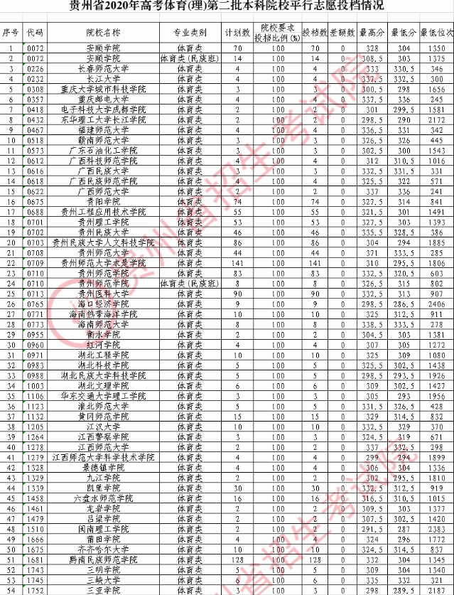 2020贵州高考体育第二批本科院校录取最低分(理科)