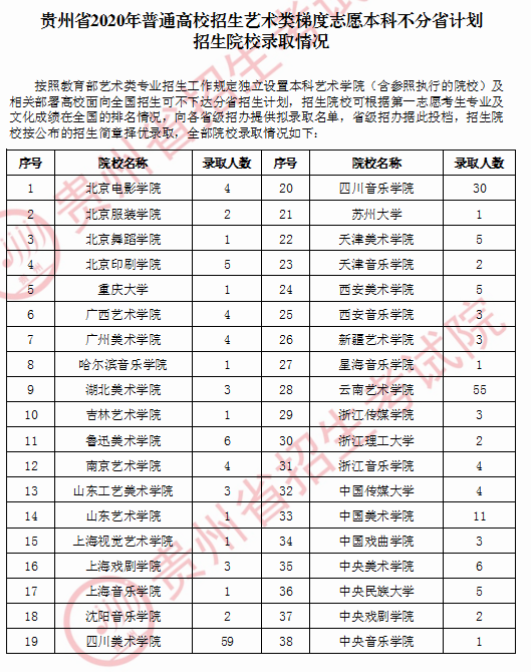 目前,同学们和广大家长朋友们非常关心的贵州省2020年普通高校招生艺术类梯度志愿本科不分省计划招生院校录取情况已经公布。下面小编为大家详细介绍一下,供大家参考。