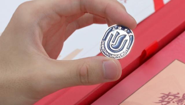 作为第一个参与校徽盲盒抽奖的人,钟奕扬非常幸运地抽中了隐藏款——“上大蓝”。据说,这款颜色的校徽只有百分之一的概率获得哦!