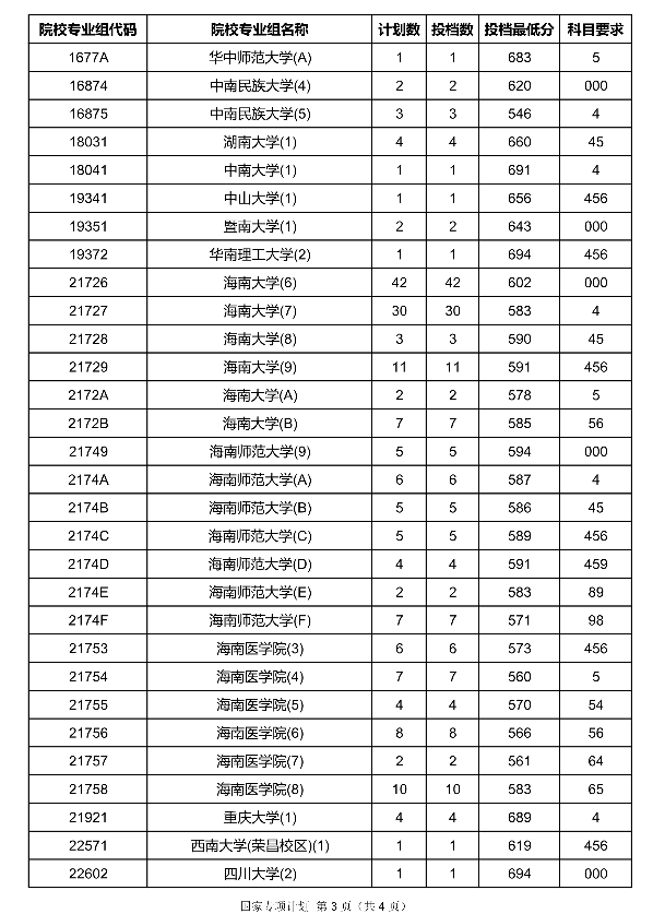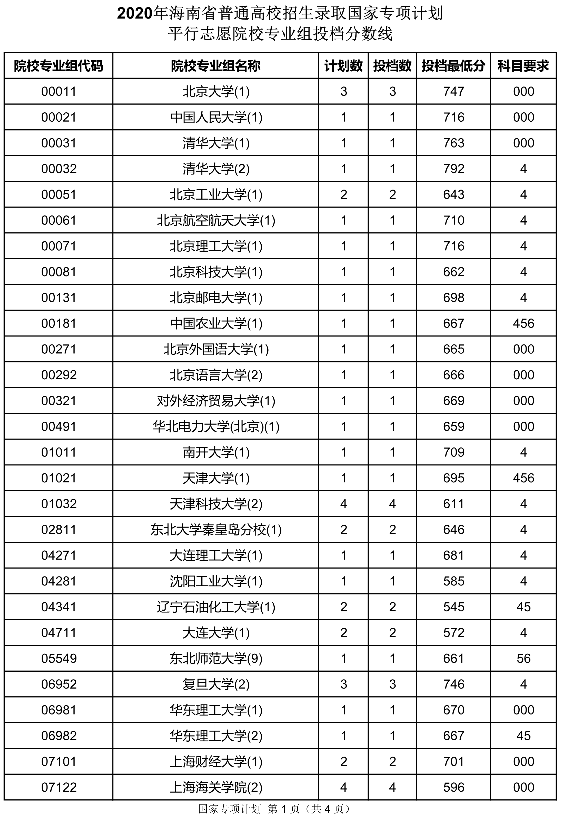 2020海南国家专项计划投档分数线 时间:2020-08-17 09:41 分数线 目前,同学们和广大家长朋友们非常关注的2020年海南省普通高校招生录取国家专项计划平行志愿院校专业组投档分数线已经公布。下面小编为大家详细介绍一下,供大家参考。海南高考国家专项计划投档分数线
