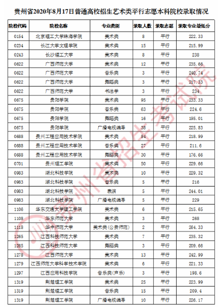 目前,同学们和广大家长朋友们非常关注的贵州省2020年普通高校招生艺术类平行志愿本科院校录取情况已经公布。下面小编为大家详细介绍一下,供大家参考。