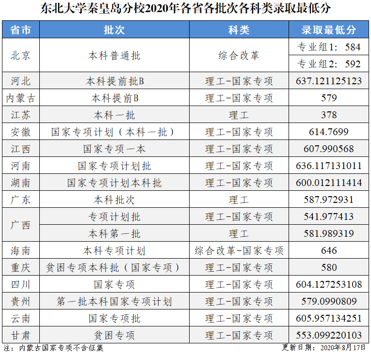 东北大学秦皇岛分校2020年各省各批次各科类最低录取分数线已经公布,本文给大家整理了具体的分数线要求,供参考。