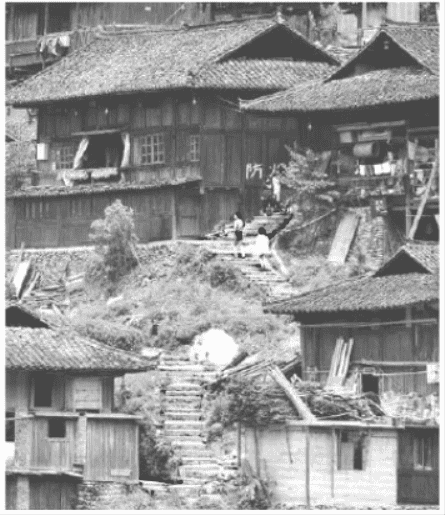 图3为贵州西江千户苗寨的景观照片。读图,回答第4题。