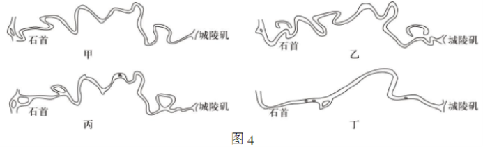图4示意1756-1960年长江石首-城陵矶段河道变化。读图,回答第5、6题。
