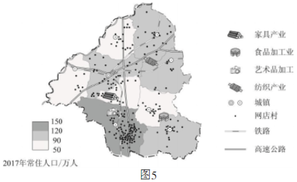 网店村是指在互联网经营网店总户数达到当地家庭户数10%以上、电子商务年交易额达到1000万元以上的村庄。2010年以来,华北平原某地级市涌现出一批网店村,经济结构从以粮食生产为主转变到依托电子商务的多种特色产业并存,如图5所示。读图,回答第7、8题。