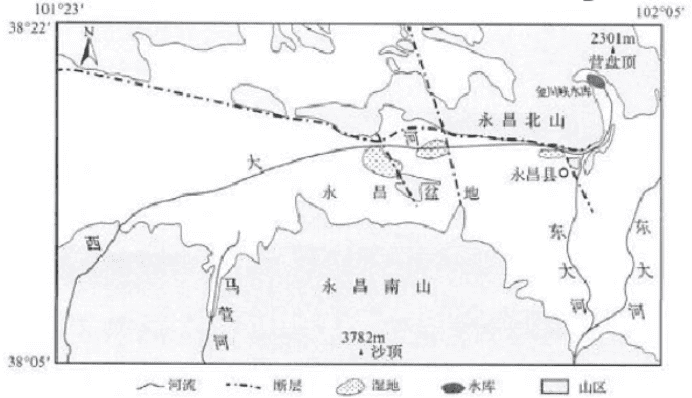 河西走廊西大河流域的永昌盆地介于永昌南山与永昌北山之间(下图),海拔1875~2106m,地势自西南向东北倾斜。盆地内分布有若千块湿地,这些湿地