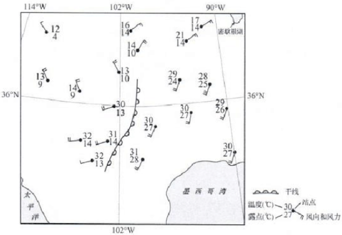 越大。一般情况下,温度相同时湿空气要比干空气密度小。两个温度相近的干、湿气团相遇所形成的锋,称为干线。下图为北美洲部分地区某时刻主要气象要素