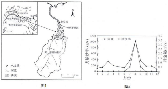 (1)研学小组依据水文站提供的资料绘制了西柳沟多年平均月输沙率和月流量变化图(图2)发现西柳沟汛期易形成峰高量大、陡涨陡落的高含沙量洪水。从外力作用的角度分析西柳沟高含沙水流的形成原因。