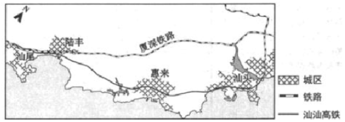 下图所示区域是潮汕文化的核心区。正在建设中的汕汕高铁连接汕头、汕尾,是我国东南沿海高速铁路通道的重要组成部分。汕汕高铁全长约163公里,桥梁和隧道约占90%,沿途设汕尾站、陆丰南站、陆丰东站、惠来站、潮南站、汕头南站、汕头站共7座车站。据此完成4~6题。