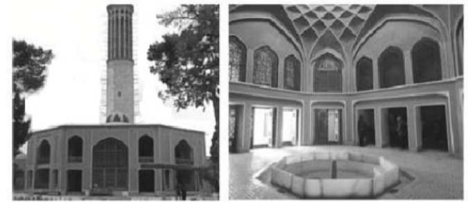 伊朗古城亚兹德古老的“风塔”是建筑物中用来通风降温的建构。风塔高过屋顶的部分四面镂空,悬空连接到室内大厅(如下左图)塔下中央建有一个水池(如下右图)。据此完成7~8题。