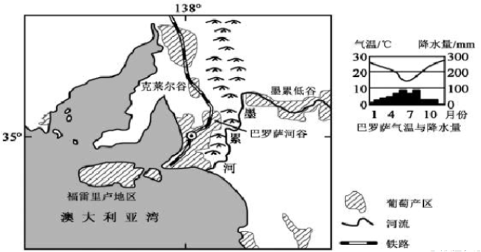 (1)本题结合当地的气候、地形、水源、土壤等角度回答。根据巴罗萨气温与降水资料统计图可知,该地属于典型的地中海气候,夏季高温少雨,光照强,昼夜温差大,有利于葡萄养分的积累;读图可知,巴罗萨河谷所在地区位于河流中下游地区,为典型的缓坡河谷地带,靠近河流,有利于灌溉,同时,坡度较缓,有利于排水;根据材料“葡萄园有着偏碱性的土层”可知,偏碱性的土壤有利于葡萄的生长;根据材料“由于年代久远,葡萄藤有着纵深的根系,抵御自然灾害的能力较强”可知,树种古老,根系深,耐旱性强。