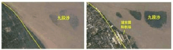 20世纪90年代中期,上海浦东机场选址过程中,专家从地理学时空视角出发,提出“将浦东国际机场原计划选址东移,建在海堤之外、潮滩(即潮间带出露的沙泥滩)之上(下图),新围的土地需要清除湿地绿滩,环境的改变对候鸟迁徙带来了负面影响。为此在长江河口九段沙(长江泥沙沉积形成的沙洲)上实施生态工程,使得机场湿地适时互补,候鸟栖息环境置换。