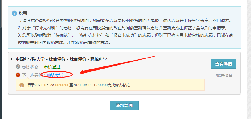 考生或家长需在2021年6月3日17:00点前登录“阳光高考特殊类型招生报名平台”(https://bm.chsi.com.cn/)“志愿管理”栏目内点击“确认考试”进行面试确认,不确认者视为放弃考试。