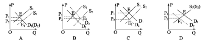 1.大豆是优质的植物蛋白资源,也是健康的食用植物油资源。随着居民消费结构升级,对大豆需 求快速增加,国内产需缺口不断才大。为实施好新形势下国家粮食安全战略,提升国产大豆自给水平,农业农村部决定从2019年起实施大豆振兴计划,采取政策、科技、投人等综合措施,推 动形成大豆振兴的合力。不考虑其他因素,对该计划可能带来的影响理解正确的是(P为价格, Q为数量,S1、S2为供给曲线,D1、D2为需求曲线,E、E1为均衡价格点)