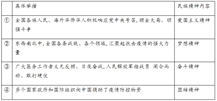 11.**强调:“精神是一个民族赖以长久生存的灵魂,唯有精神上达到一定的高 度,这个民族才能在历史的洪流中屹立不倒、奋勇向前。”新冠肺炎疫情发生以来,14亿 中国人民团结一心,众志成城,诊释了凝聚中华民族磅礴伟力的伟大精神。对于此次战役中体现的民族精神对应正确的是