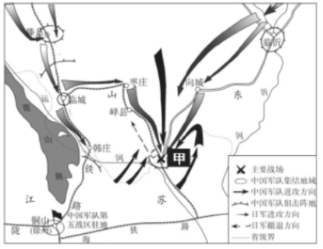 11.在抗日战争中,中国军民众志成城,扬长避短,取得了一次又一次的胜利。图示是抗战时期的一次重要战役,其中“甲”处是