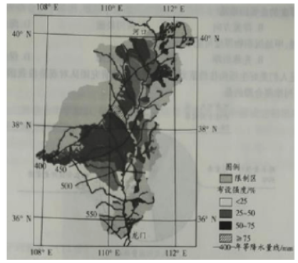 黄河中游河(口)龙(门)区间干流河段长725千米,流城面积11万平方千米,是黄土高原的主要推成部分,流域面积在000平万千米以上的较大支流有21条,打坝淤地是该区城治理水土流失的主要批区将流城现存大型淤地坝數量和大型淤地坝布设潜力的比值称为淤地坝布设强度。下图示意河龙区间淤地坝布设强度与限制区分布。
