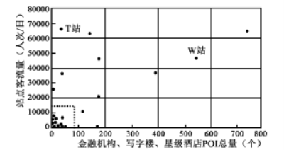 POI是包含地理事物名称、经纬度、类型等多种属性信息的点状空间数据,其数量的多少可以近似反映相应功能的强弱,图2示意2015年沪宁沿线8个城市28个高铁站点的客流量,以及站点周边2千米范围内商务类POI总量。据此完成4~6题。