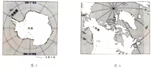 大陆冰盖延伸入海形成冰架,冰架断裂漂浮海上形成冰山。南极海域冰山多为桌状,体积较大。北极海域冰山多里塔状,体积较小。格陵兰岛沿海的冰山在向南漂移过程中往往形成极为壮现的北极冰山走廊。图5示意南极洲主要冰架分布,下图6示意北美洲北冰洋沿岸及附近地区。据此完成13~15题。