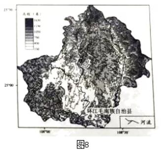 广西环江毛南族自治县喀斯特地貌典型。以前,当地一直延续着石头缝里种玉米的传统种植习惯,结果耕地越来越少,出露的石头越来越多,老百姓越来越穷。近年来,该县探索多种保护性发展模式。采用“种草养牛”模式的农户年收入已从过去每年500-600元,提高到现在每年7000-8000多元,走出了一条喀斯特贫困地区脱贫攻坚、资源可持续利用和高质量绿色发展的新路。图8示意环江毛南族自治县位置和地形。