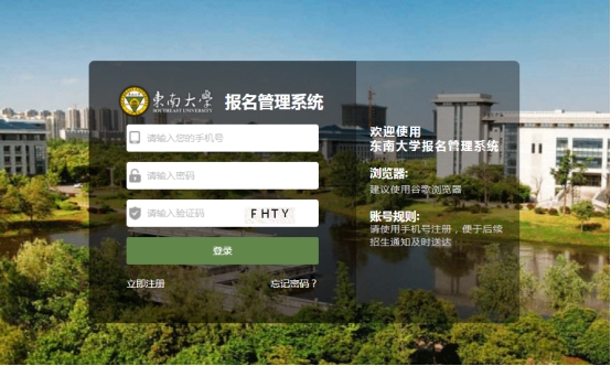 1、登录东南大学招生报名管理系统(http://bkzs.seu.edu.cn/bkzs/sys/zsbmglappseu/login/index.do),账号为登录阳光高考平台高水平艺术团/运动队报名系统注册手机号,密码为考生身份证号,输入验证码,点击“登录”。