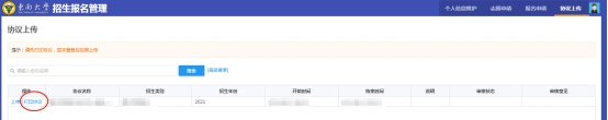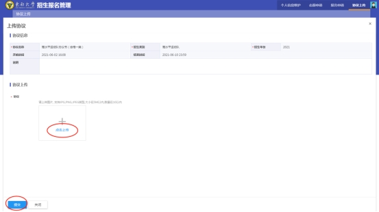 7、点击“点击上传”按钮(如图中红圈所示),上传签字后的协议书照片(获得高水平运动队“优秀”等级的考生还须一并上传签字后的《2021年东南大学招收高水平运动队单考考生志愿登记表》),点击图片可以浏览大图,核查清晰无误后点击“提交”按钮。