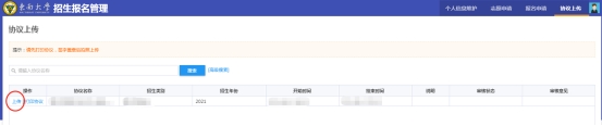 6、签署协议书后,再次登录系统,点击右上角“协议上传”进入页面,点击左侧“上传”按钮(如图中红圈所示)。