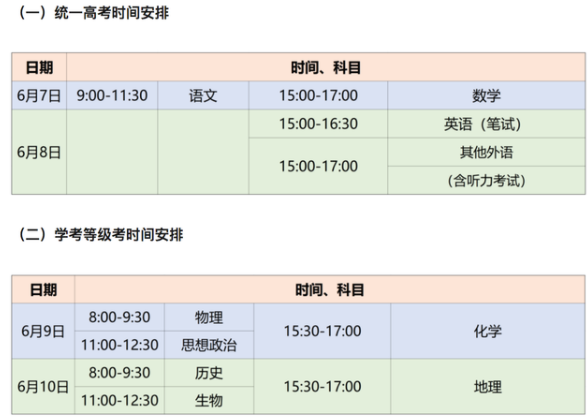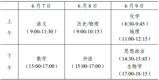 全国统考于6月7日开始举行,具体科目考试时间安排为:6月7日9:00至11:30语文;15:00至17:00数学。6月8日9:00至11:30文科综合/理科综合;15:00至17:00外语,有外语听力测试内容的应安排在外语笔试考试开始前进行。