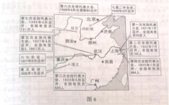 图6是中国共产党建立至中华人民共和国成立间部分重要会议示意图。从图中任选两次会议,根据材料并结合所学知识,简析两次会议间中国共产党的发展,并说明其原因。(要求:明确列出两次会议,观点正确,史实准确,论证充分,表述清晰。)
