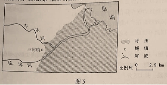 圩田是在低洼地筑堤围出的田地。图5所示圩田海拔 6~7米,种植庄稼;巢湖多年平均水位8.03米。据记载,在清朝嘉庆年间,三河镇濒临巢湖。