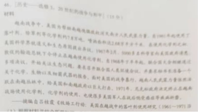 (2)根据材料并结合所学知识,说明美国在越南战争中使用化学剂的后果。(6分)