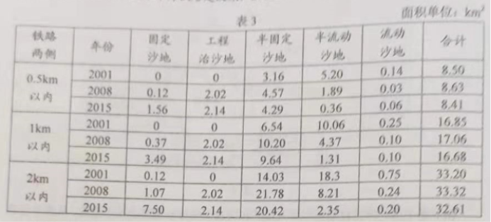 为评估青藏铁路建设和营运对环境的影响,某科研团队对青藏铁路格(尔木)拉(萨)段某11千米长的风沙活动路段两侧进行了调查,结果如表3所示,其中工程治沙地视为固定沙地。2001~2008年为铁路建设期,2008年~2015年为铁路营运期。