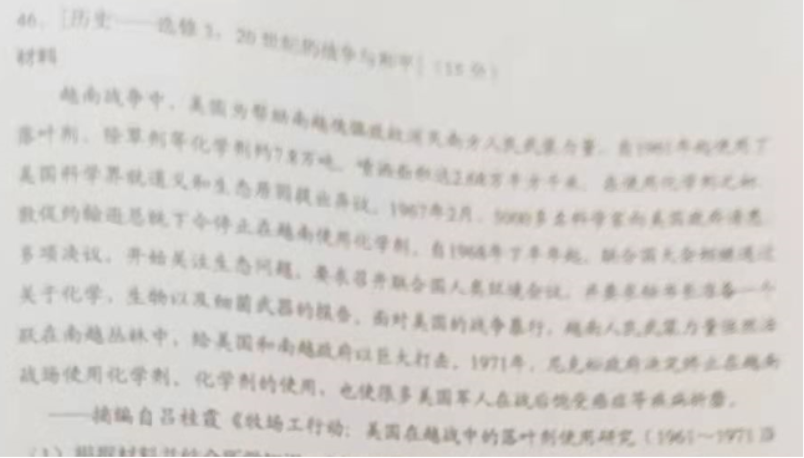 (2)根据材料并结合所学知识,说明美国在越南战争中使用化学剂的后果。(6分)